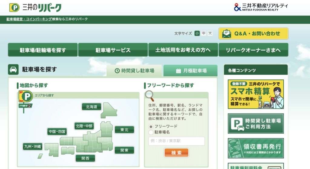 三井のリパークは、三井不動産グループの一員として、駐車場経営の提案から設備設置、運営管理までまとめて相談しやすい会社です。全国で約16,000カ所の運営管理実績があり、24時間365日のトラブル対応体制も打ち出しています。大手グループの総合力や、初めて駐車場経営を行うオーナーでも任せやすい管理体制を重視する場合に向いています。