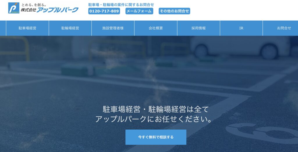 アップルパークは、コインパーキングと月極駐車場、さらに駐輪場の運営・管理にも対応している会社です。首都圏を中心に長年のノウハウを蓄積しており、24時間365日のコールセンター、定期メンテナンス、販促や収益改善対策まで含めた管理体制を整えています。管理業務を幅広く任せたい場合や、首都圏中心で実績を重視したい場合に比較しやすい会社です。