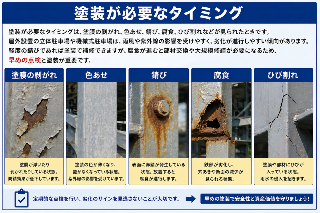 塗装が必要なタイミングは、塗膜の剥がれ、色あせ、錆び、腐食、ひび割れなどが見られたときです。屋外設置の立体駐車場や機械式駐車場は、雨風や紫外線の影響を受けやすく、劣化が進行しやすい傾向があります。軽度の錆びであれば塗装で補修できますが、腐食が進むと部材交換や大規模修繕が必要になるため、早めの点検と塗装が重要です。